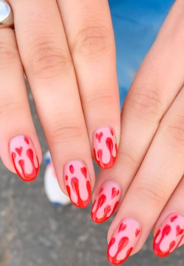 Perfect for when you have a breakup but still wanna slay Valentine’s Day! These dripping red nails with tiny hearts give off serious love gone edgy vibes. T he bold red on the soft pink base makes a fierce statement—part sweet, part savage.