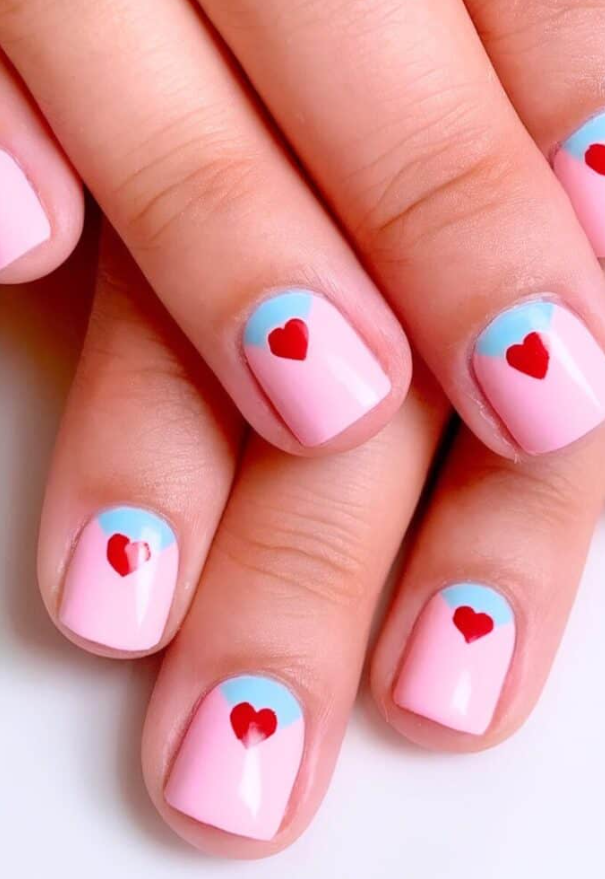 Perfect for short nails, this design is all kinds of adorable! The baby pink base paired with a soft blue French tip creates such a fresh and playful look, while the tiny red hearts add the perfect Valentine’s Day touch. It’s sweet, simple, and effortlessly cute—ideal for anyone who loves a minimalist yet festive vibe.