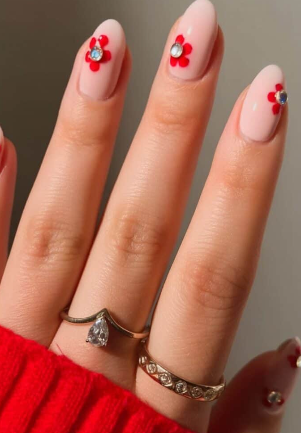 These nails are giving major flirty and fun vibes! The soft nude base creates a clean, polished look, while the red flower accents with sparkling blue gems add a playful pop of color. It’s a fresh and cheerful design, perfect for Valentine’s Day or any time you want your nails to stand out in the cutest way possible.