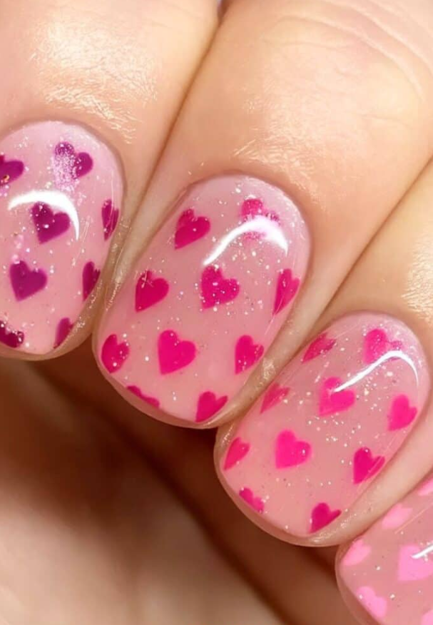 These nails are straight-up adorbs! The sheer pink base is all soft and sweet, but those tiny hot pink and purple hearts take it to a whole new level of Valentine’s Day cuteness. Add in the subtle sparkle, and it’s giving major flirty, fun vibes. Perfect for when you want to keep things low-key but still show off some serious love for the season.