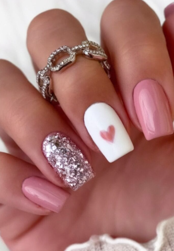 These nails are the perfect mix of glam and romance! The soft pink polish paired with the sparkly glitter accent nail adds just the right amount of dazzle, while the white nail with the delicate heart detail keeps it sweet and simple. It’s an effortlessly chic look that’s great for celebrating Valentine’s Day with a little extra sparkle.