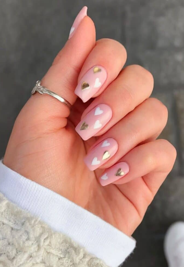 Subtle yet so adorable, these nails are perfect for a soft and romantic vibe! The pale pink base creates a sweet and feminine look, while the mix of white and gold hearts adds a delicate touch of charm. This design is effortlessly chic and ideal for Valentine’s Day or any occasion when you want your nails to feel a little extra special.
