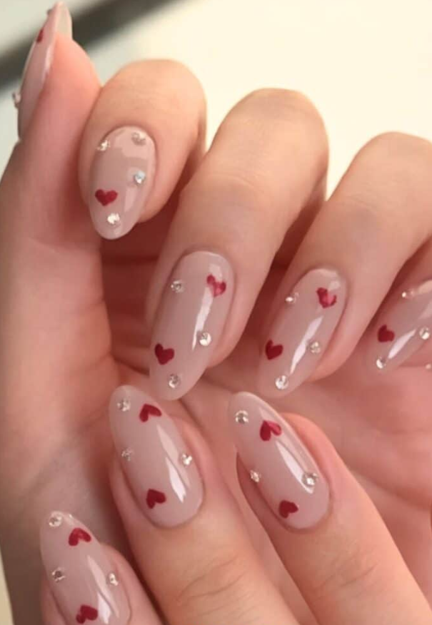 These nails are all about elegance with a sprinkle of love! The soft nude base creates such a clean and classy vibe, while the delicate red hearts and tiny rhinestones add just the right amount of sparkle and romance. It’s a subtle yet stunning design, perfect for celebrating Valentine’s Day in a chic, understated way.