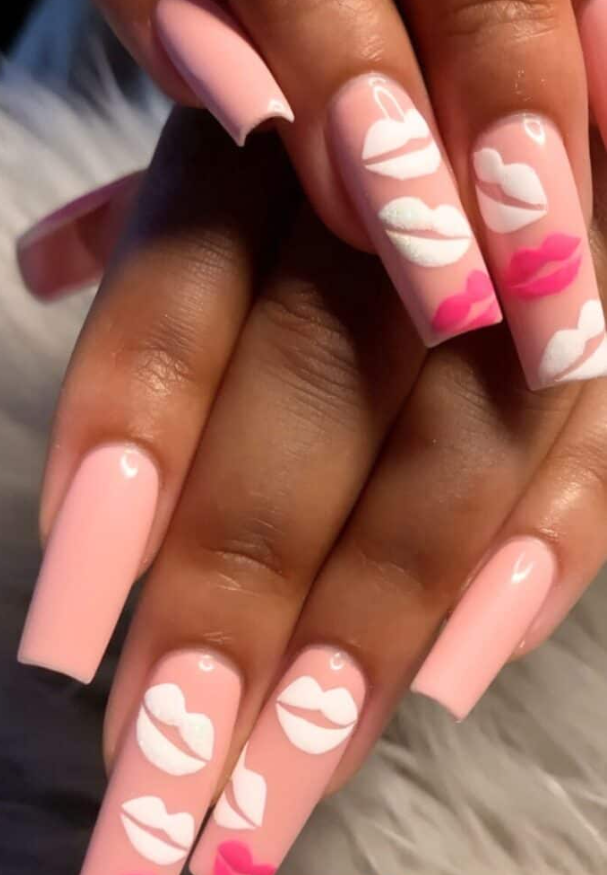 These nails are absolutely giving kissable vibes! The soft pink base is perfect for Valentine’s Day, but those lip designs in white and hot pink? Total show-stoppers. They’re flirty, fun, and extra cute—basically everything you need for a date night or Galentine’s hangout. Obsessed with how they’re playful but still totally chic.
