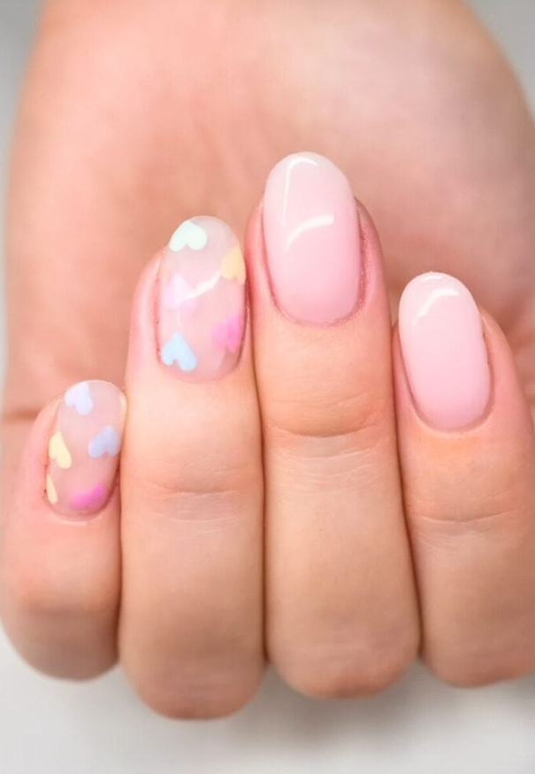 These nails are giving soft and dreamy vibes! The delicate pink base keeps it classic, while the pastel-colored hearts scattered across a clear accent nail add a whimsical and playful touch. It’s like candy for your fingertips, perfect for Valentine’s Day or any time you want a sweet and subtle design.