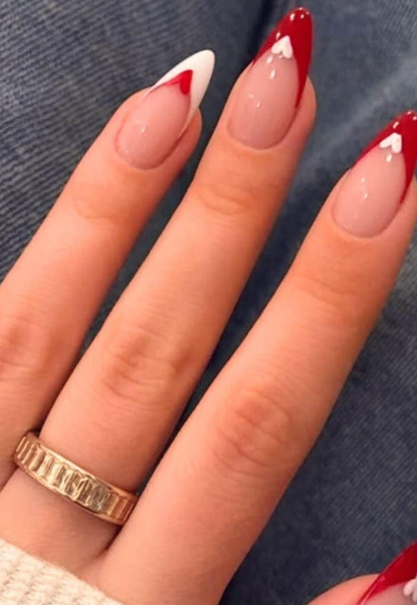 These nails are the definition of modern romance! The sharp red tips with tiny heart accents give a bold twist to the classic French manicure, while the single white tip adds a playful contrast. The sleek almond shape makes them even more elegant and perfect for Valentine’s Day.