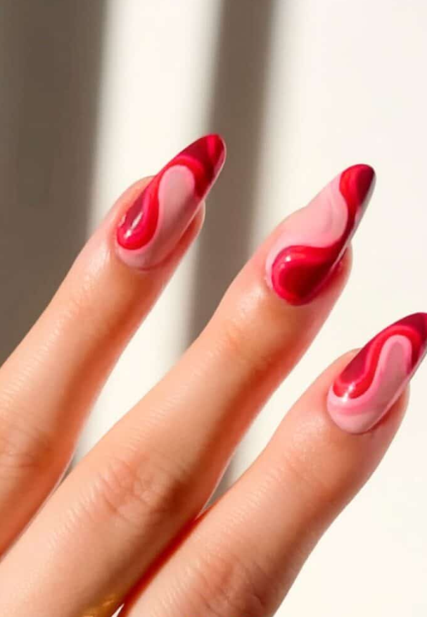 These nails are screaming pure Valentine’s Day elegance with a modern twist – and I’m here for it. The deep reds and soft pinks swirl together in a chic, abstract design that’s bold yet totally wearable. These nails are a stunning way to show off your love for the season while keeping things classy and unique.