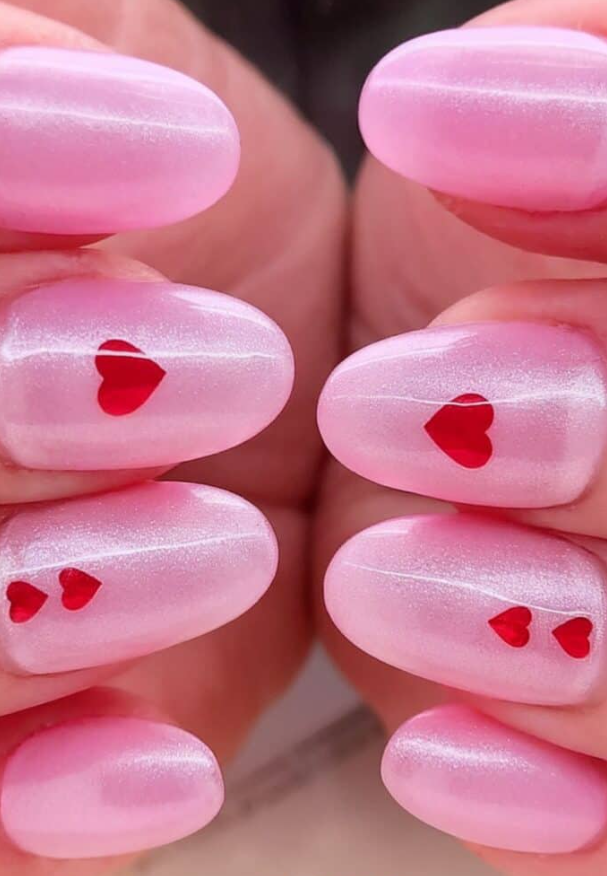 I’m obsessed with how soft and sweet these nails look! The pearly pink shimmer gives off such a dreamy vibe, and those tiny red hearts add the perfect Valentine’s touch. It’s simple, delicate, and absolutely adorable for anyone who loves a subtle yet romantic nail design. These are total heart eyes nails for sure!