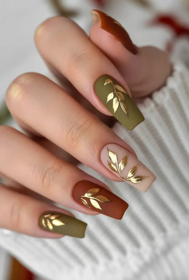 When you desire a manicure that encompasses the entire season simultaneously, then this matte set with a mix of brown and olive green, beige, and rust is it. The palette is bound with golden leaf accents and every nail is a small canvas. It’s advanced, grounded and precisely the type of inspo I would pin on Pinterest boards during the fall.