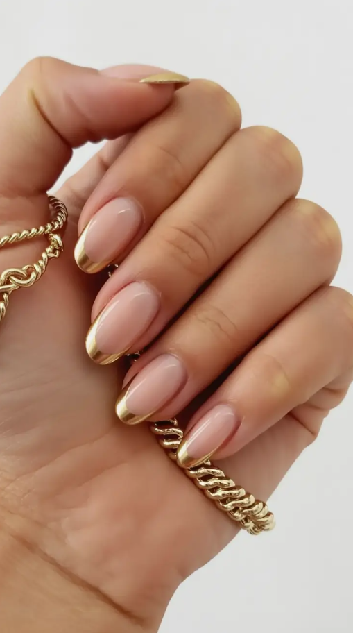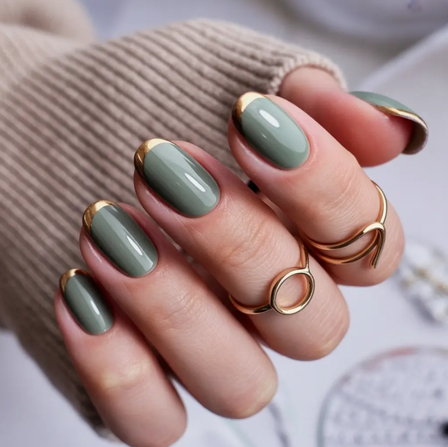 The combination of metallic gold with olive green is something that looks chic with ease. This is a classic manicure with a French twist, only a short and rounded one, which gives the classic design a modern touch and a refined touch. It is smooth and friendly, the type of nails that can equally be used on the weekend as they can be used on a dinner date.