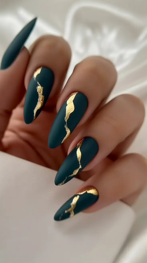 Green dark nails with golden cracks are the ultimate luxury. This appearance is inspired by natural stone, but in a more daring and moody way. It is strong, gracious and perfectly on point with the 2025 trend of blending grounded tones with metallics.