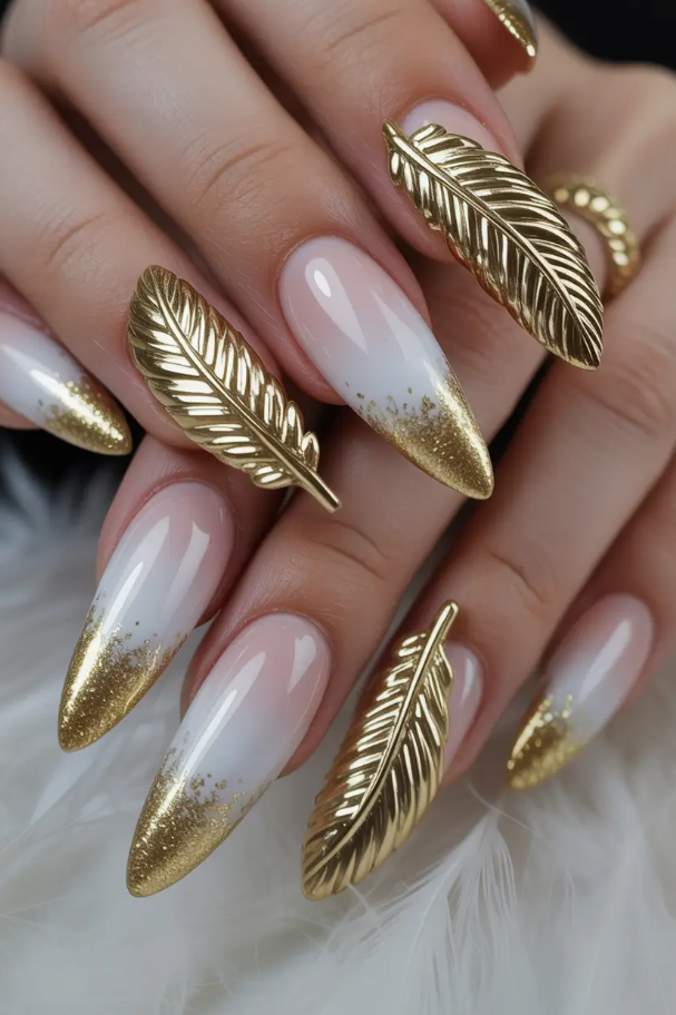 It is the dream of any person who loves the nail art that is maximalist. Long, thin tips with a soft ombré fade of white and gold are topped with 3D feather decorations in full metallic shine. It is dramatic, luxurious, and highly editorial- exactly what you would find in high-fashion magazines.