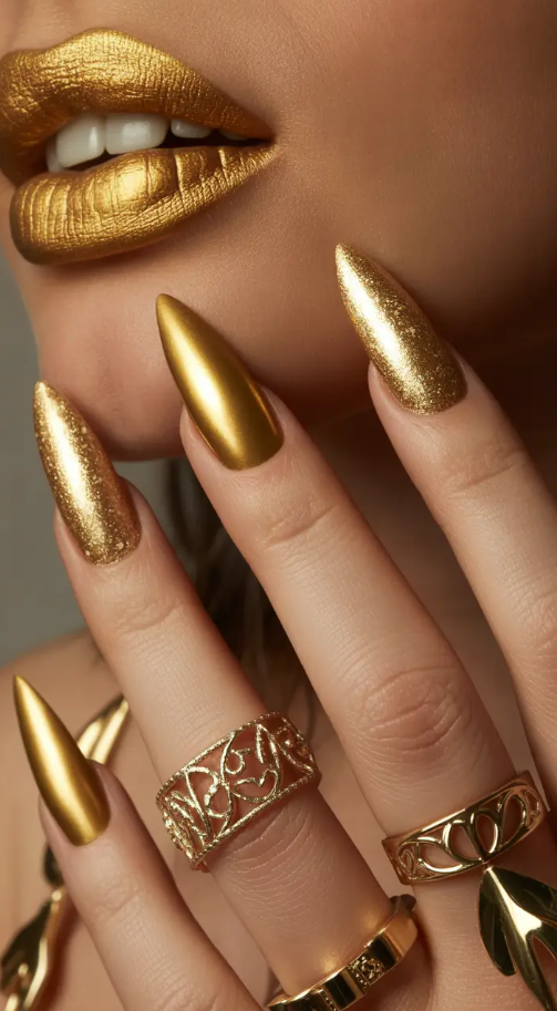 Less is sometimes more. This set is shaped like an almond and fully covered with metallic gold polish that exudes sophistication and simplicity. No additional accents, no glitter, but nothing but pure golden radiance. It is a bold and minimalist decision that is simultaneously timeless and modern, which will fit well into the 2025 trend cycle.