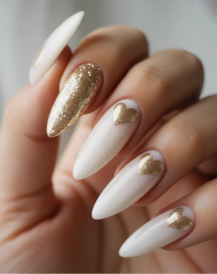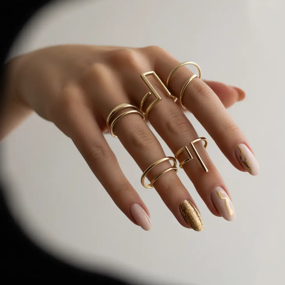 The last appearance is a fashionable mix of nude bases with well-considered golden decorations- one nail entirely glittered, a second one with tiny golden leaf decorations, and others left plain. It is contemporary, minimal, yet not boring.