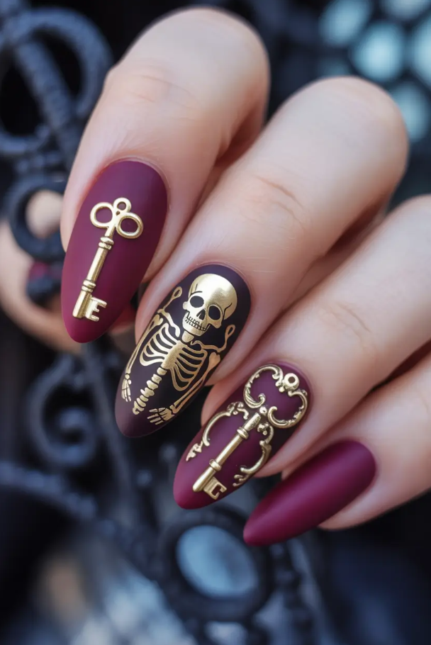 Those in need of drama this season, deep burgundy and matte nails with gold skeletal art and vintage key accents are all. This manicure has a gothic touch that is brash but cool- perfect during the fall when the weather is crisp and Halloween is only a few days away.