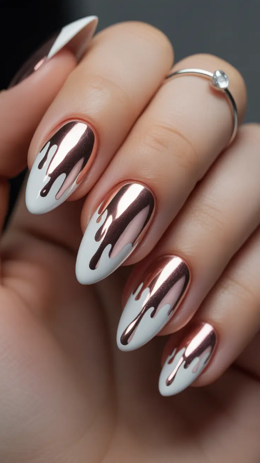 These nails add a playful touch with molten drips of metallic rose spilling down a white and base. It is both edgy and feminine, and that is why it is one of my favorite concepts to play with in 2025. The design does not look forced, instead it flows naturally, as liquid metal down the nails, due to the shape which is almond like.