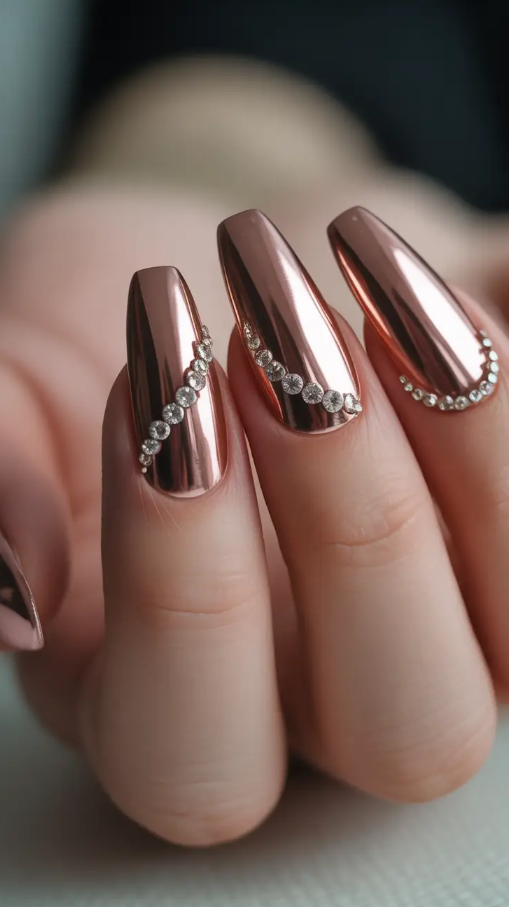 These acrylic-style rose chrome nails with glittering crystal decorations are the most dramatic nail to those who crave the drama. The metallic is softened by the rose undertones and feels more wearable yet glamorous.