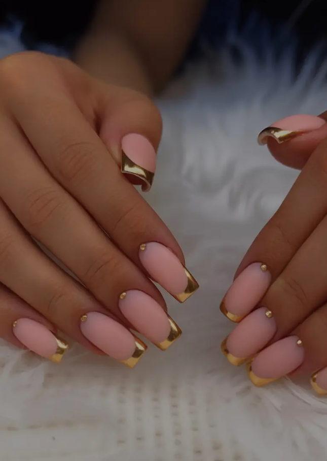 Traditional and lighthearted, this set is made of soft blush pink and smooth tips of gold. Minuscule studs on the cuticles provide sparkle, which makes it equally feminine and elegant. It is the type of manicure that will never go by the wayside due to its timelessness with a twist.