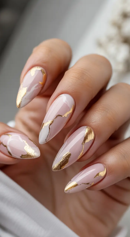 Marble nails do not lack anything, but with touches of gold, they enter the realm of absolute luxury. This combination is a blend of creamy whites, deep burgundy and shades of caramel brown and gold foil, making an artistic swirl that seems to be made of fine stone. It is the type that reflects the light in the best way and you find yourself standing and staring at the detail.