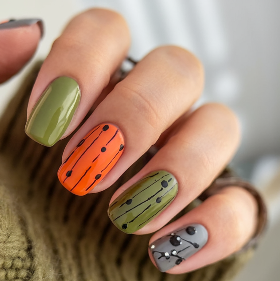 This modern art-inspired set is all about playful energy. Olive, green, grey, and pumpkin orange make a fun fall palette, and the abstract line-and-dot design gives it just the right amount of edge — like something you’d spot at a trendy boutique.