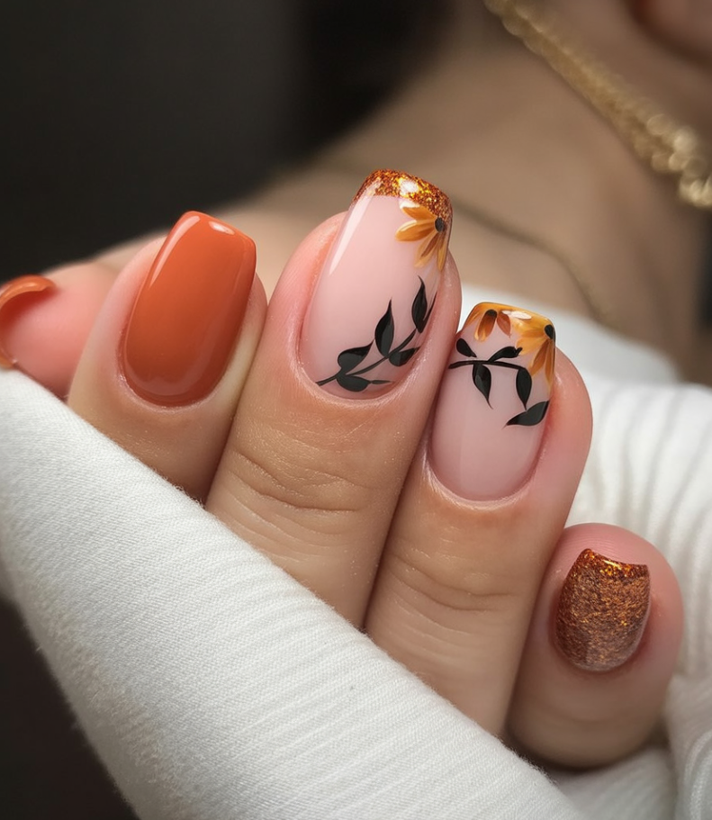 Sweater weather yells it out in the best way possible with this design. Its golden flowery accents combined with burnt orange and copper glitter tips makes me feel it as a warm day in September. It is light and down-to-earth, also akin to pumpkin picking in the cardigan you love most of all (made of cashmere).