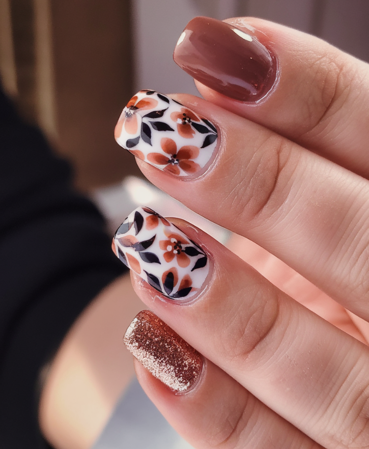 This square shape is small, and it fits on every type of nail perfectly; it can be paired with some earthy colors, such as camel, rust, or brown. This is your go-to if you enjoy a touch of floral but do not want to go all springtime.
