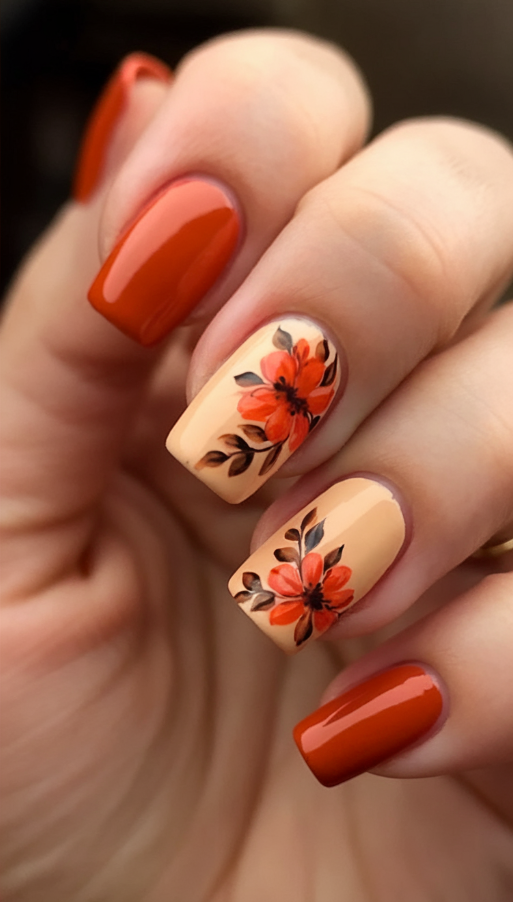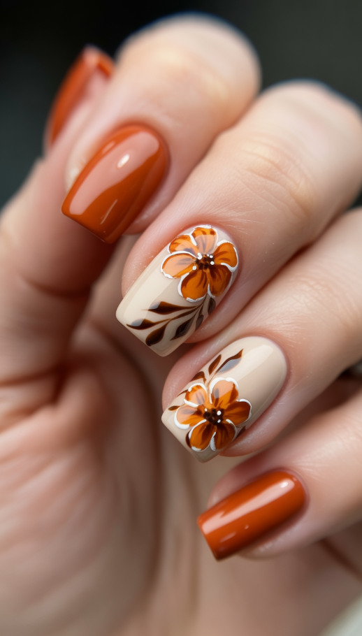 These oversized florals make a statement without shouting. The off-pudding/brownish orange color scheme is every bit as in-season as it can be, but it is the oversized, super painterly petals that bring this to the level of high fashion on your fingertips. Warm and bold – as a fashionable scarf in the nails.