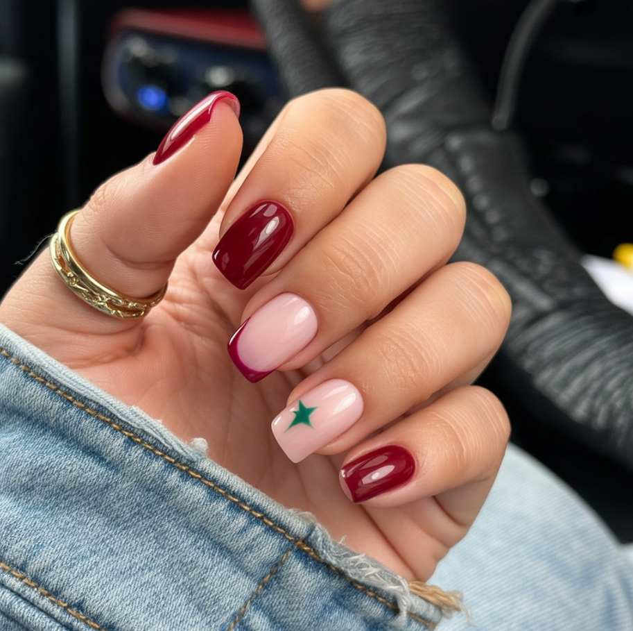 This french short design is washing up to be bold and playful with some whimsy, which is perfect because it is “modern diva energy”. The shiny burgundy tips are fabulous but the pink base and that cute little green star tone them down, the crimson, the pink and that darling green and white star are a surprise but so lovely.