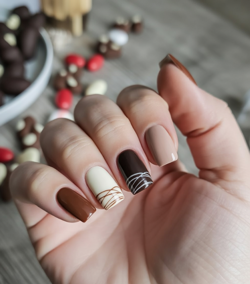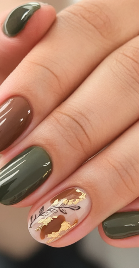 This shape looks extremely elegant with short brown nails, which have an oval or square tip, and provide a particularly flattering look without making an extra effort. When you tend more to natural, earth shades, and want a little bit of glitter, this is your heavenly combination of tone-down and drama.