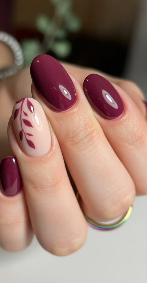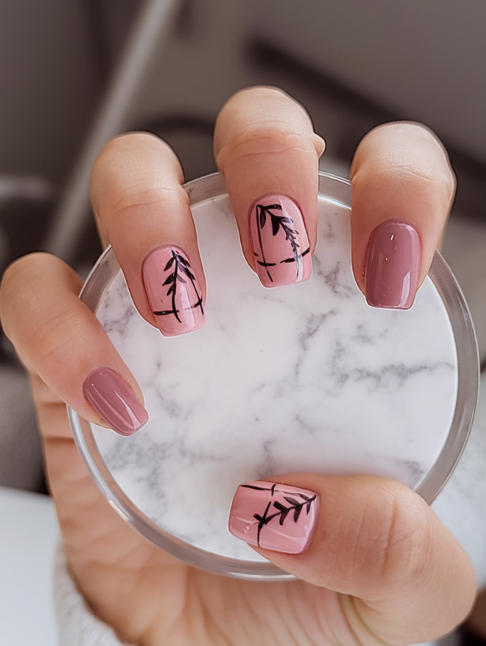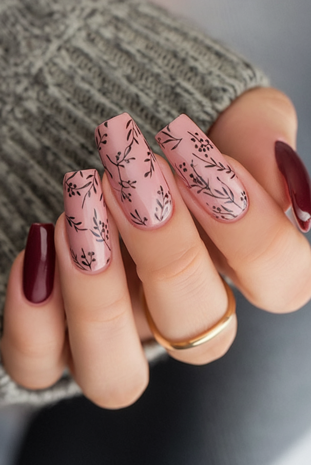 So, it you are a sort of woman, who is fond of detail and daintiness, this one will run your heart away. The matte pink nails are complimented with the thinnest botanical drawings in black, which brings the sense of silence and style. Supporting depth The burgundy accent nails provide the contrast that is necessary to anchor the appearance, almost like leaves falling on the cloth.