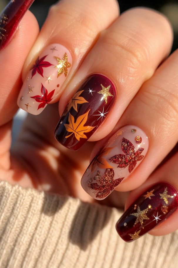 This ensemble creates some autumn magic with a combination of deep burgundy, shining gold stars, and maple leaves. It is warm and glittery like the rays of the sun through the trees during a cold night.