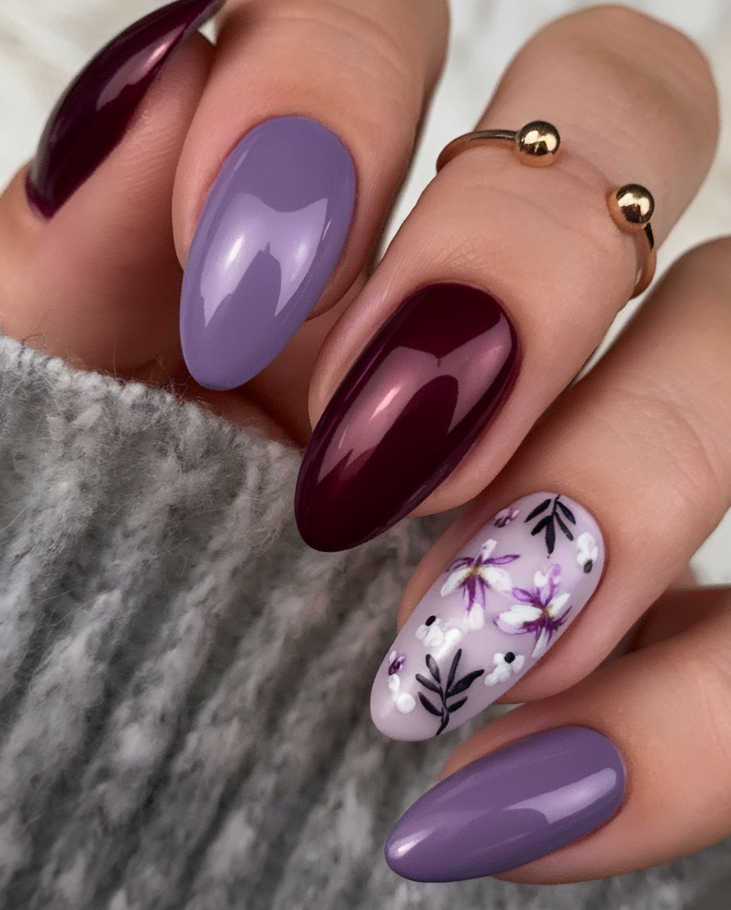 Surprising yet completely dreamy, this combination of plum and lavender is a fresh florally palette on fall nails. It is moody but light, a bit romantic and a bit mysterious.Suitable on long almond or square nails, especially in case you prefer something less dark than dark red, but contrasting still. Pair it with a comfy knit in neutral hues or be bold with matching lipstick and you have full-on goddess fall down to a T.