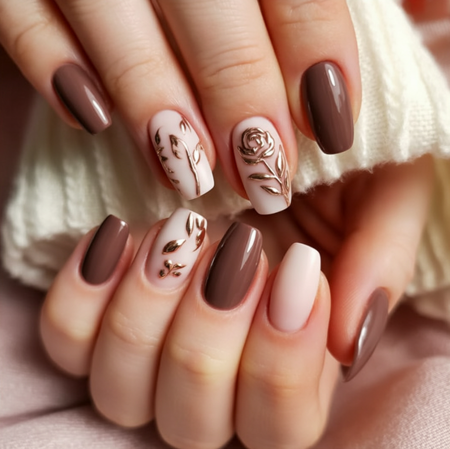 This design is like a warm embrace that is made of luxury since it combines creamy shades with embossed metallic rose gold. The floral shapes resemble some kind of jewelry on your fingertips, proud, but refined, ordered, but flowing.