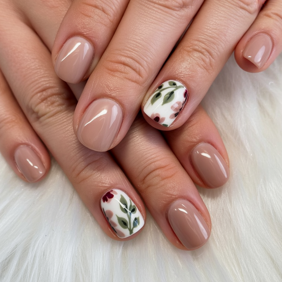 Nude nails can be never boring and this small flower accent is evidence. The neutral almost warm palette used on the eye is a soothing cushion that mixes with the artwork on the ring finger, giving that fresh blooming effect that is ideal during the fall transition.