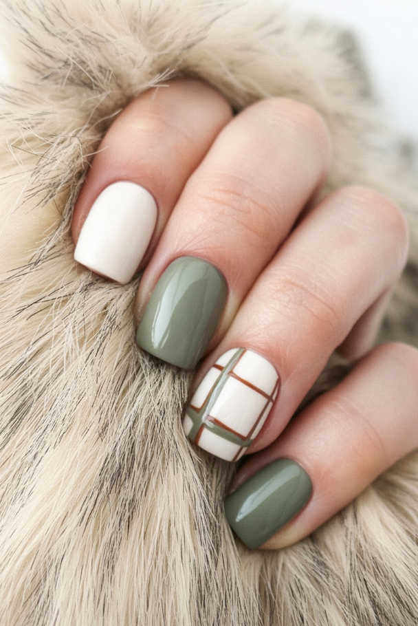 Is there anything cozier than plaid in fall? This contemporary touch introduces soft sage and creamy white some refreshing ideas of fall color. It is neat, comforting, and whisperingly stylish, and looks like nail art made out of your favorite oversized cardigan.