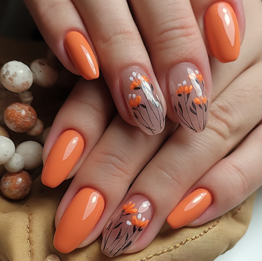 These nails pack a punch! The large, daring flower is orange with big petals and nearly a fall bouquet appears in your finger tips. Against peachy nude colour, the pattern is new yet comfortable enough like hot cider with piece of orange peel.