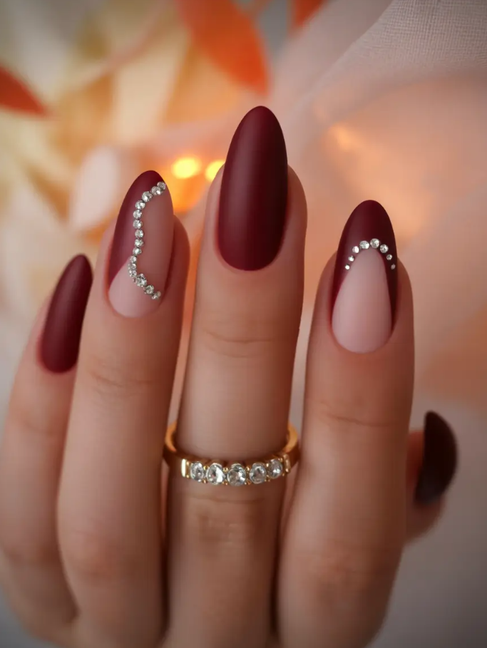 This group is matte classy mixing deep burgundies, nude cutouts, and rhinestone swerves that seem more custom without being too precious. It leans classic fall with a little glam on the side—exactly what you’d want when the weather turns crisp but your calendar still says “girls’ night.”