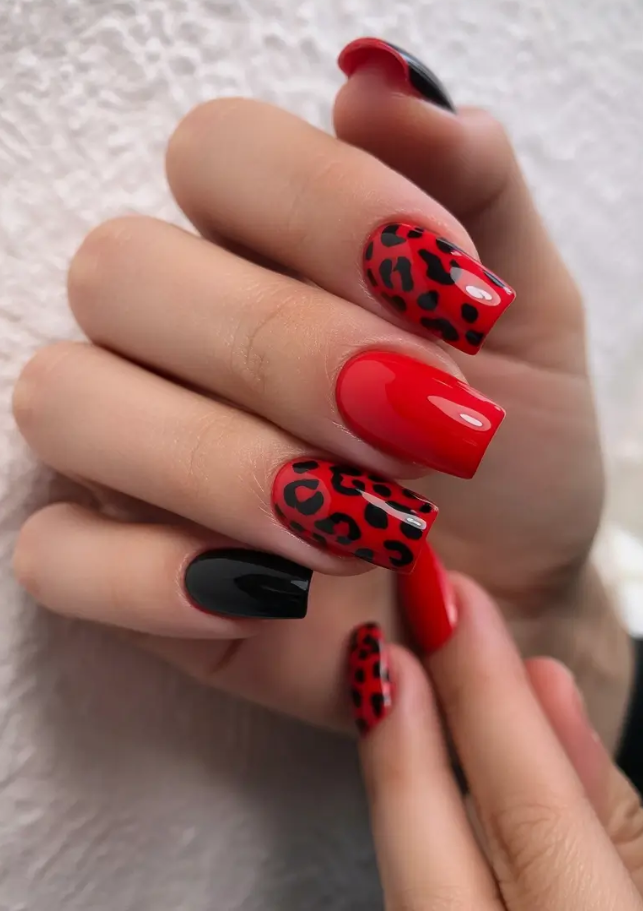 Hot red, bold black and square short form make a retro element to this early fall concept. The leopard spots are high-gloss and the red-black animal print screams 90s cool girl, but then the red-black animal print balances out with full color nails on this design which is actually shockingly versatile. Think grunge with a side of TikTok polish.