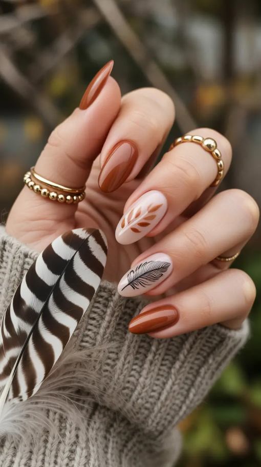 Warm brown coloring, negative space and a little bit of leaf detail? This is a mani-pedi that is the cosmetic analogy to drinking hot cider as the leaves change and fall. Its almond shape makes it remain light and lady and the cinnamon polish exudes all autumn feels.