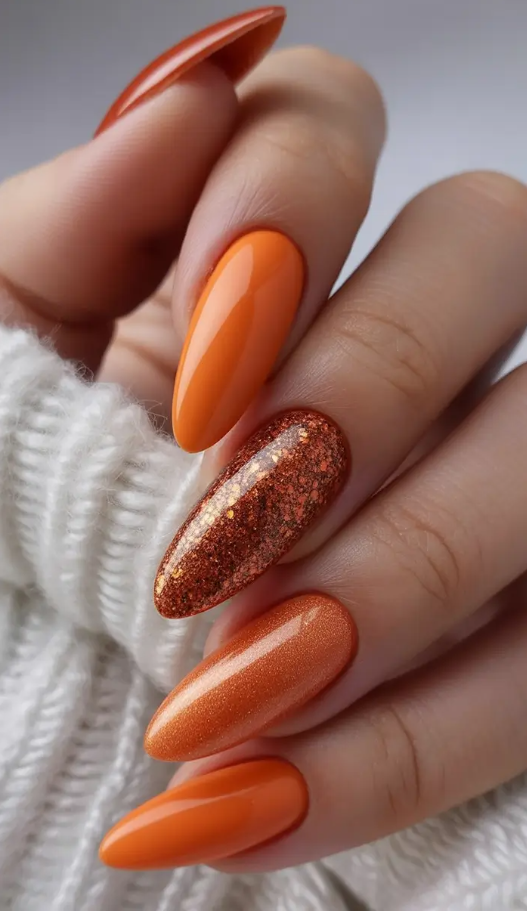 Nothing is more official fall is here than orange–but this wonky delta makes it special with coffin glitter and smooth satin shimmering. It is almost a bonfire nail and the most daring pumpkin latte. These are shiny, juicy and moving acrylic nails of colors.