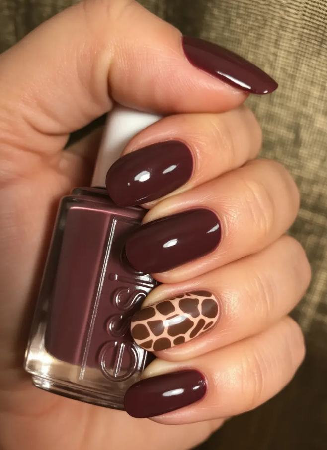 And this is the twist I wasn’t expecting–lots of burgundy polish with the one giraffe-print nail as a contrast. It’s fun but mature, unexpected but not over-the-top. The short colors gel finish enables it to be worn to all places including the office and evening.