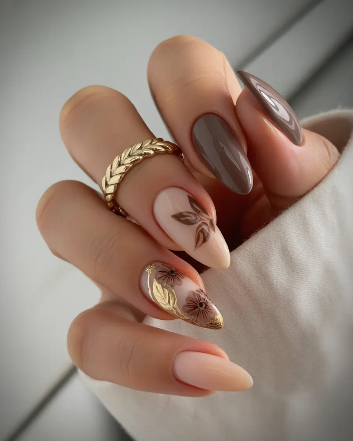 The latter design mixes toned down brown and nude colors with subtle flower ornament and gold foil decoration. Almond shape is soft and elegant, which makes it a perfect way of switching between the sun-kissed and sweater-weather skin. The florals are intricate but not loud—think “romantic walk in a leaf-strewn park” energy.