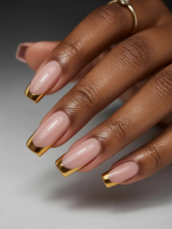 This is your luxe minimalist moment. A clean naked foundation and dazzling gold French manicures on the tips which are all about silent pride. It is hygienic, in a higher level and more than surprising to wear in all ages. When you do not know what to do in early fall- this is always a yes.