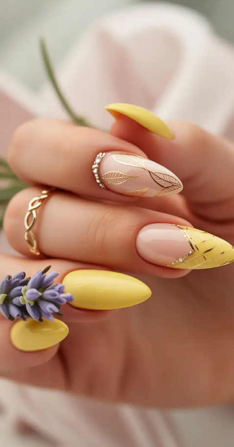 This set is all about playful luxury. Buttery tones of yellow merge with naked nails with gold leaf accents and lattice-like pattern. The oval almond shape softens the bold tones, making it the perfect choice when you’re not quite ready to say goodbye to sunny days but still want that early fall sparkle. It’s sunshine with a cashmere cardigan.