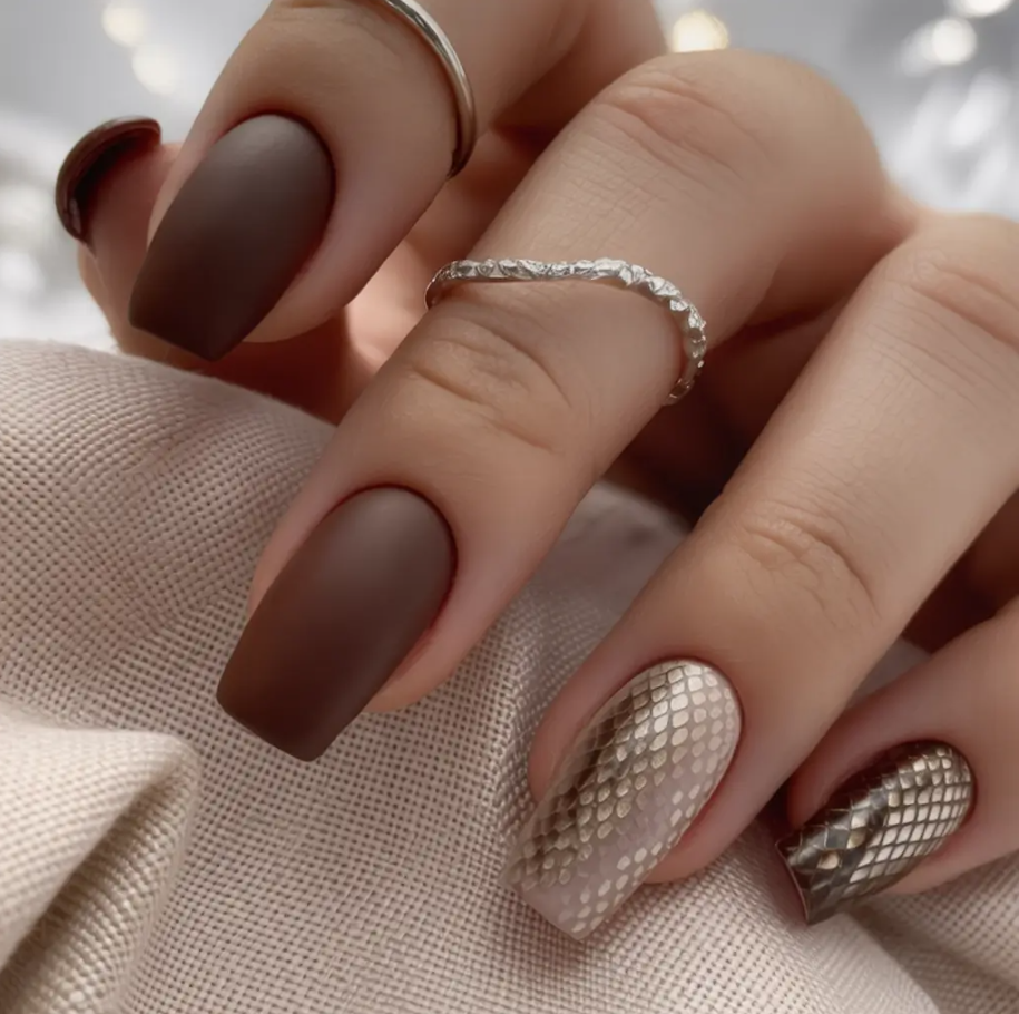 Such brown matte appearance is earthy, stylish, and rather versatile. The faux snakeskin nail coloring on two fingers gives variety without gaining too much weight to the palette. It is just a sort of restrained understated luxury that looks very good with anything literally anything–think structured coats, knit sweaters, or even your favorite latte.