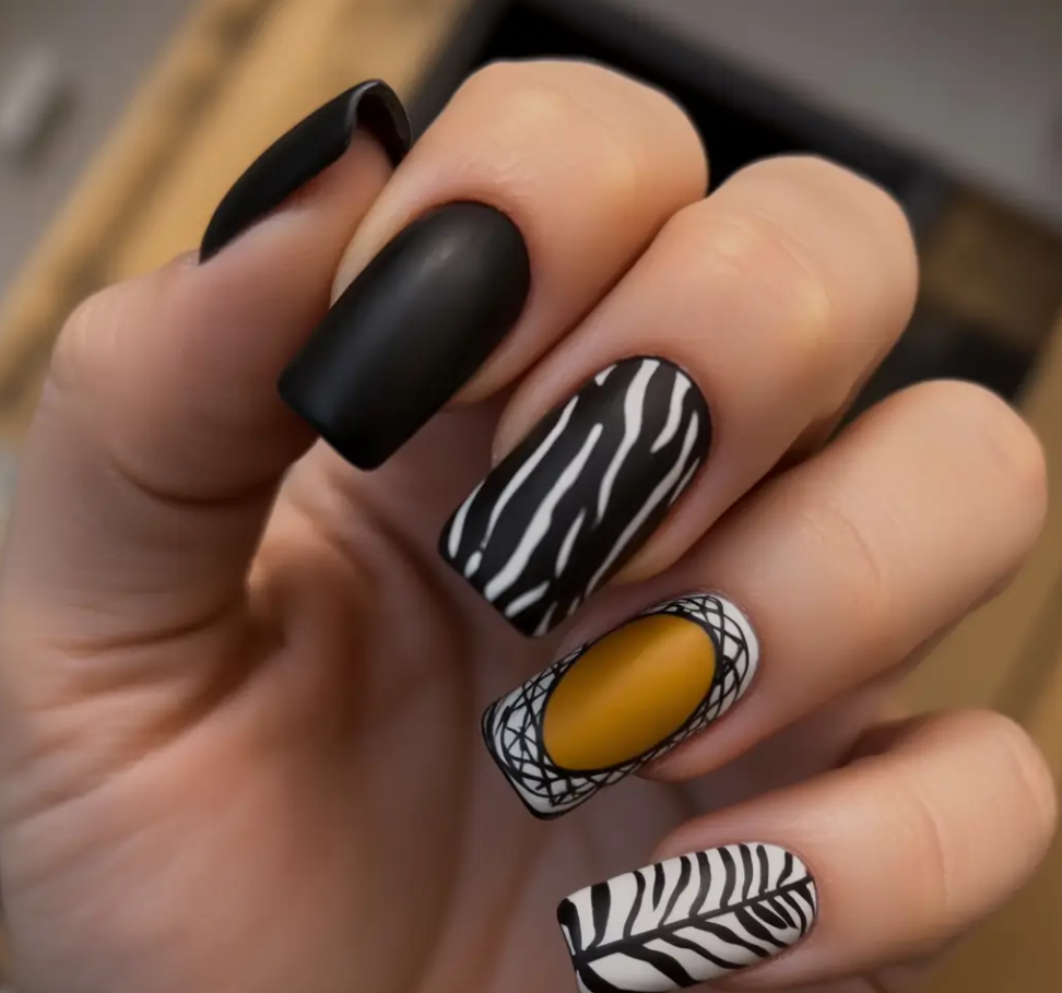 This manicure is a full service designs 2025 look all right: loud, artistic and completely unreserved. Dark matte black undertones are set off by zebra-style prints and a mustard yellow focal point which is very forward and contemporary. It’s graphic, edgy, and gives serious gallery-opening energy.