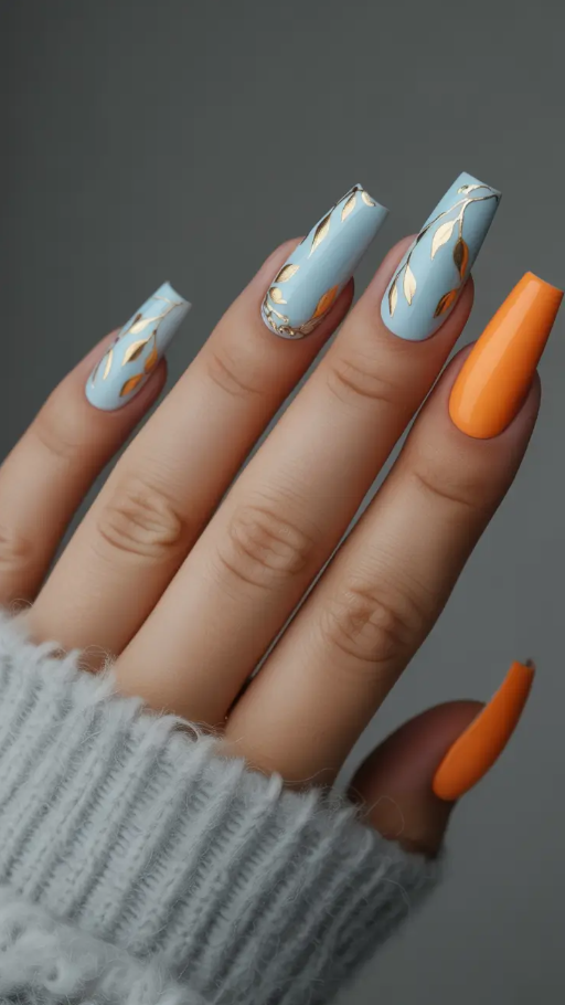 Who says fall can’t have a little sky? The manicure is an icy blue with some delicate gold leafing and a gorgeous touch of bold orange giving both softness and warmth. It is like the clear fall sky over gold fields-surprising and completely chic.