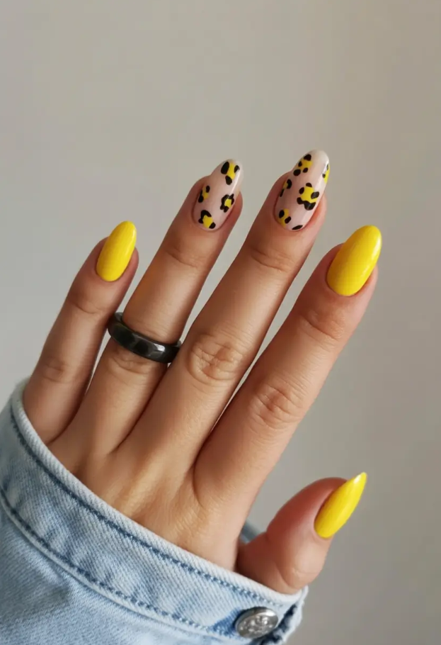 Bright yellow and minimal leopard runs together in this design encapsulating that awesomeness of a late summer and early fall layering. It is crazy, but neat structurally- allowing those almond shaped nails to bring the attitude. The funny animal print on nude base maintains things playful, and wearable.