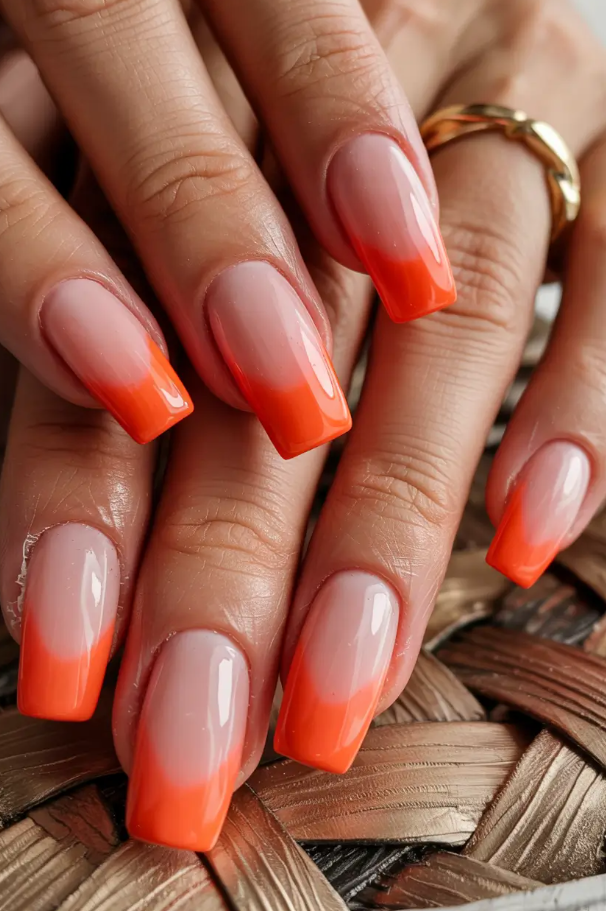 Orange ombr and fade to creamy pink nude-say yes. The colors in this design are inclined towards that eternal warm glow of autumn and present your nails with a simple but yet stunning character. It is ideal when you want something looking seasonal but without going too overboard on motifs and art.
