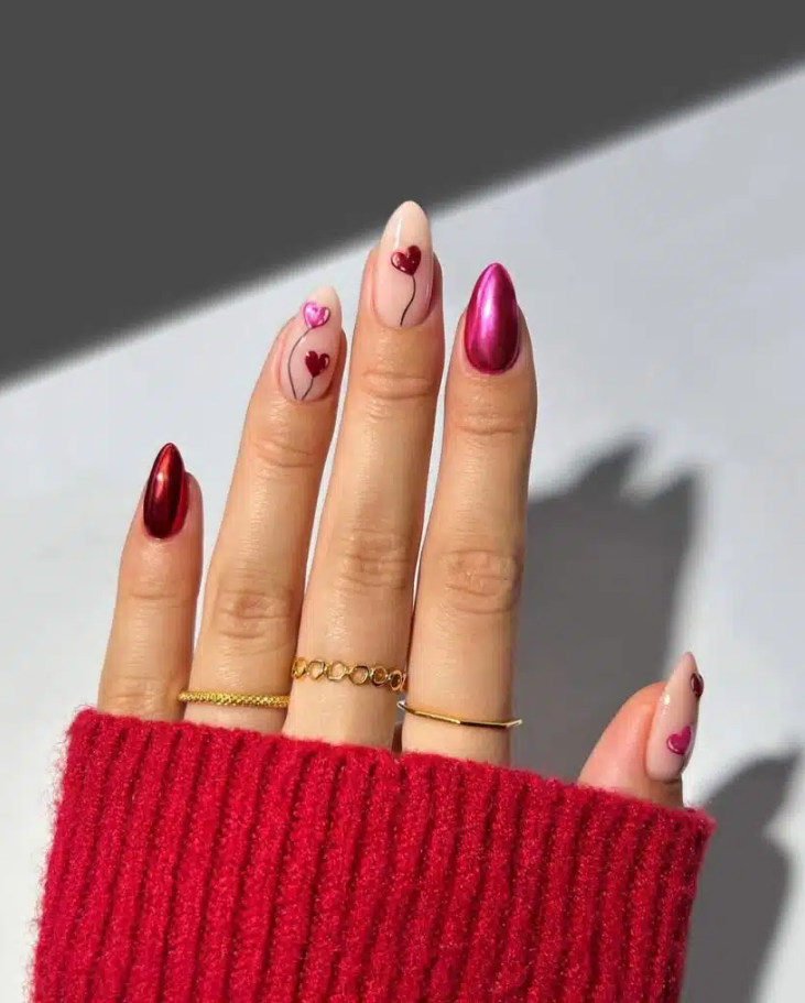 This combo of shiny metallic reds and pinks paired with delicate heart balloon designs is a stunning nod to dreamy Valentine’s day nail ideas!